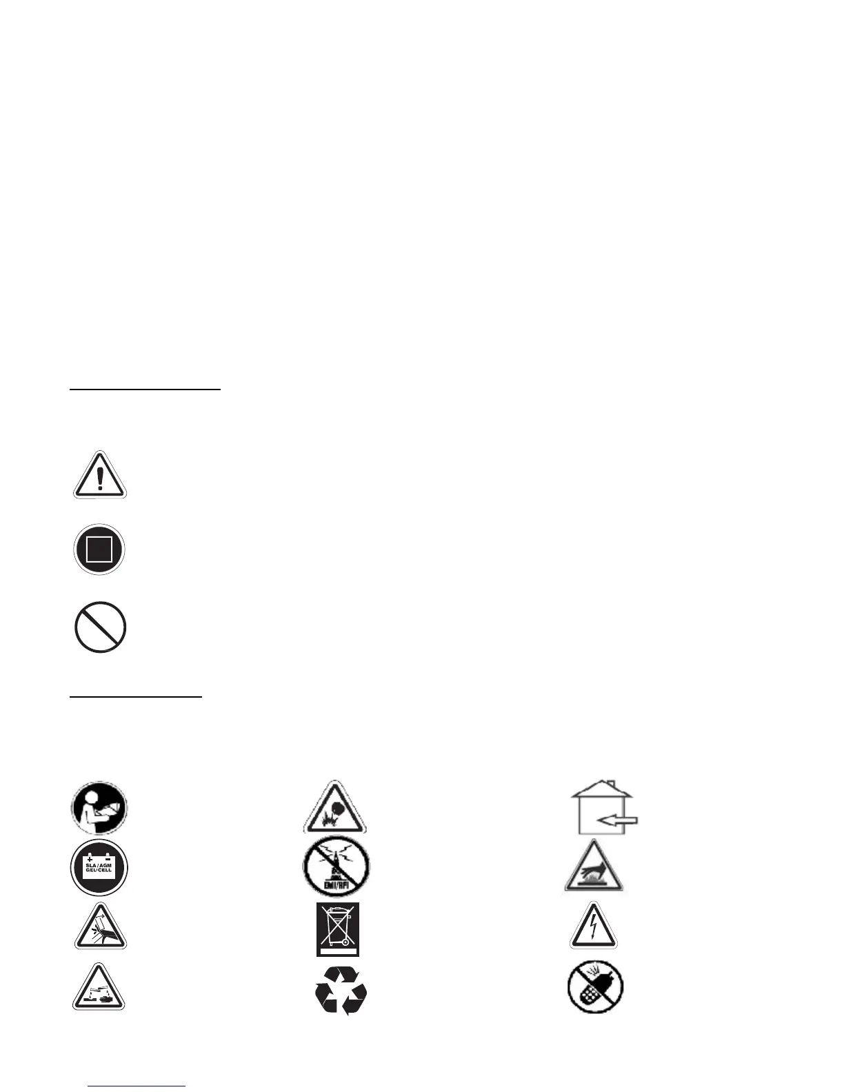 The symbols below identify warnings, mandatory actions, and prohibited actions. They