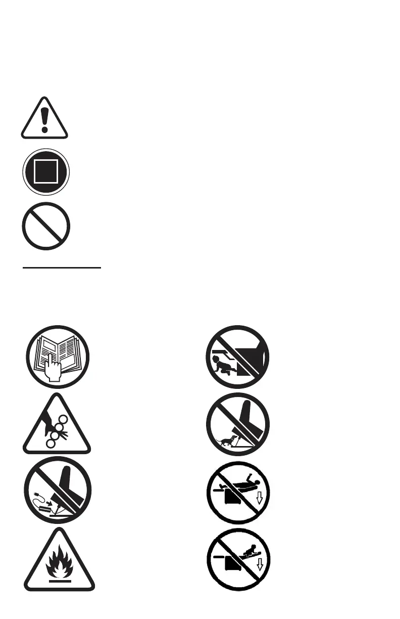 The symbols below identify warnings, mandatory actions, and prohibited