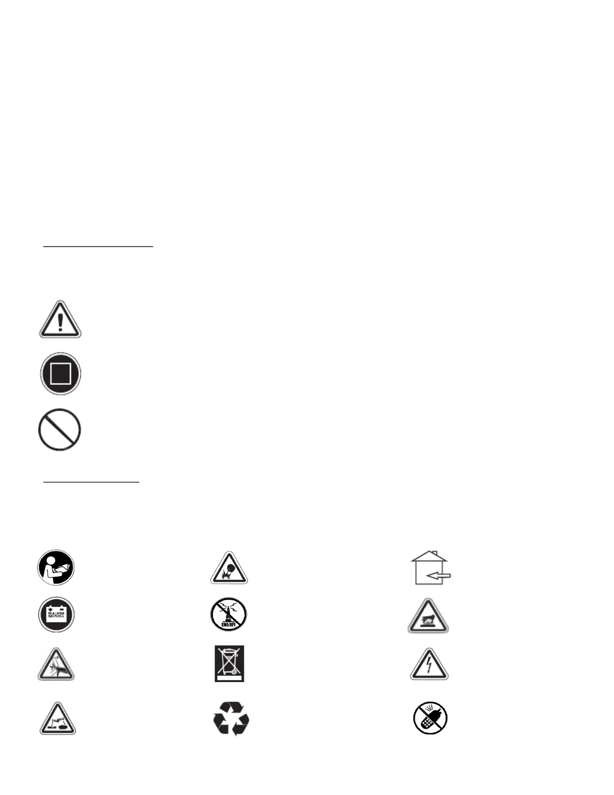 The symbols below identify warnings, mandatory actions, and prohibited actions. They