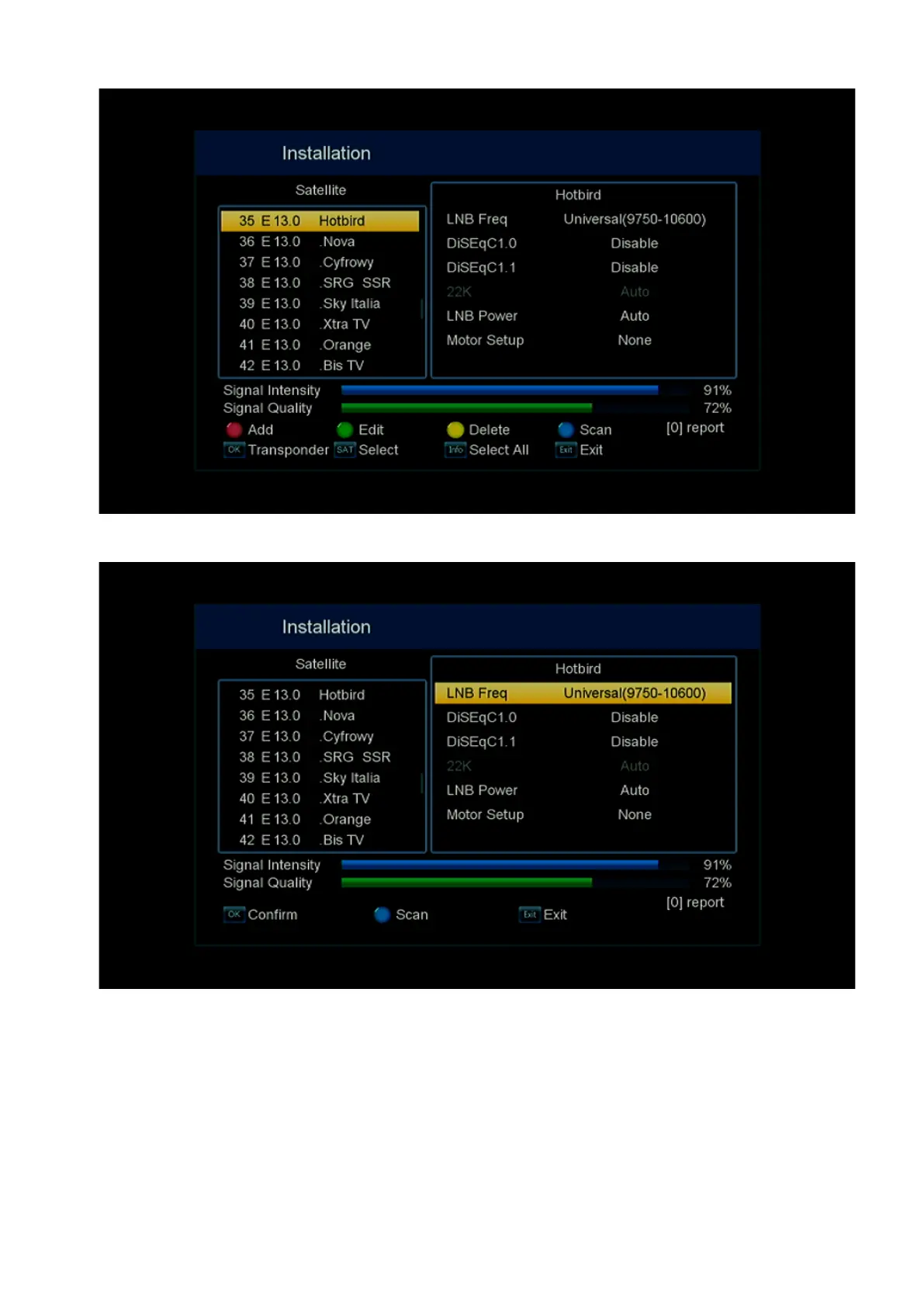 LNB Frequency – indicates the frequency or frequencies of the LNB local oscillators;