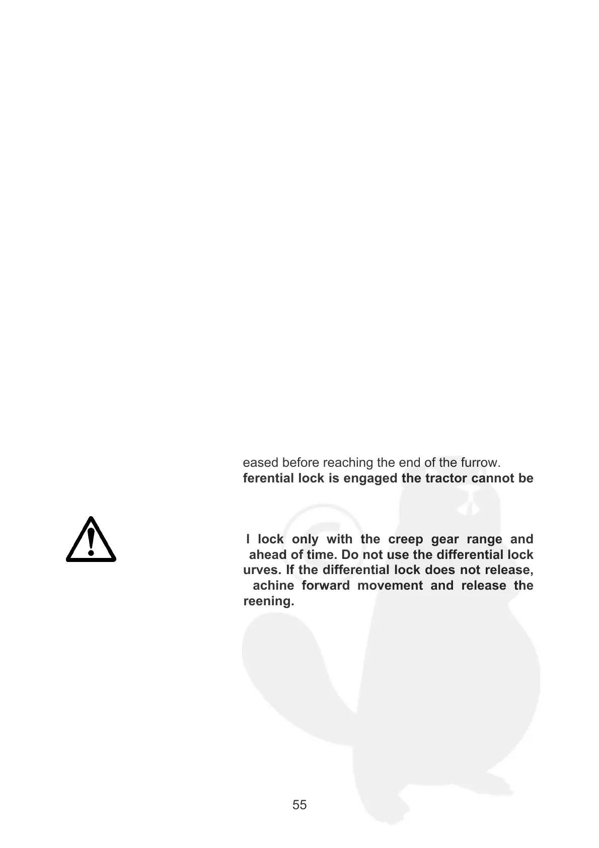 applied. The front differential lock should be used only when the furrow has