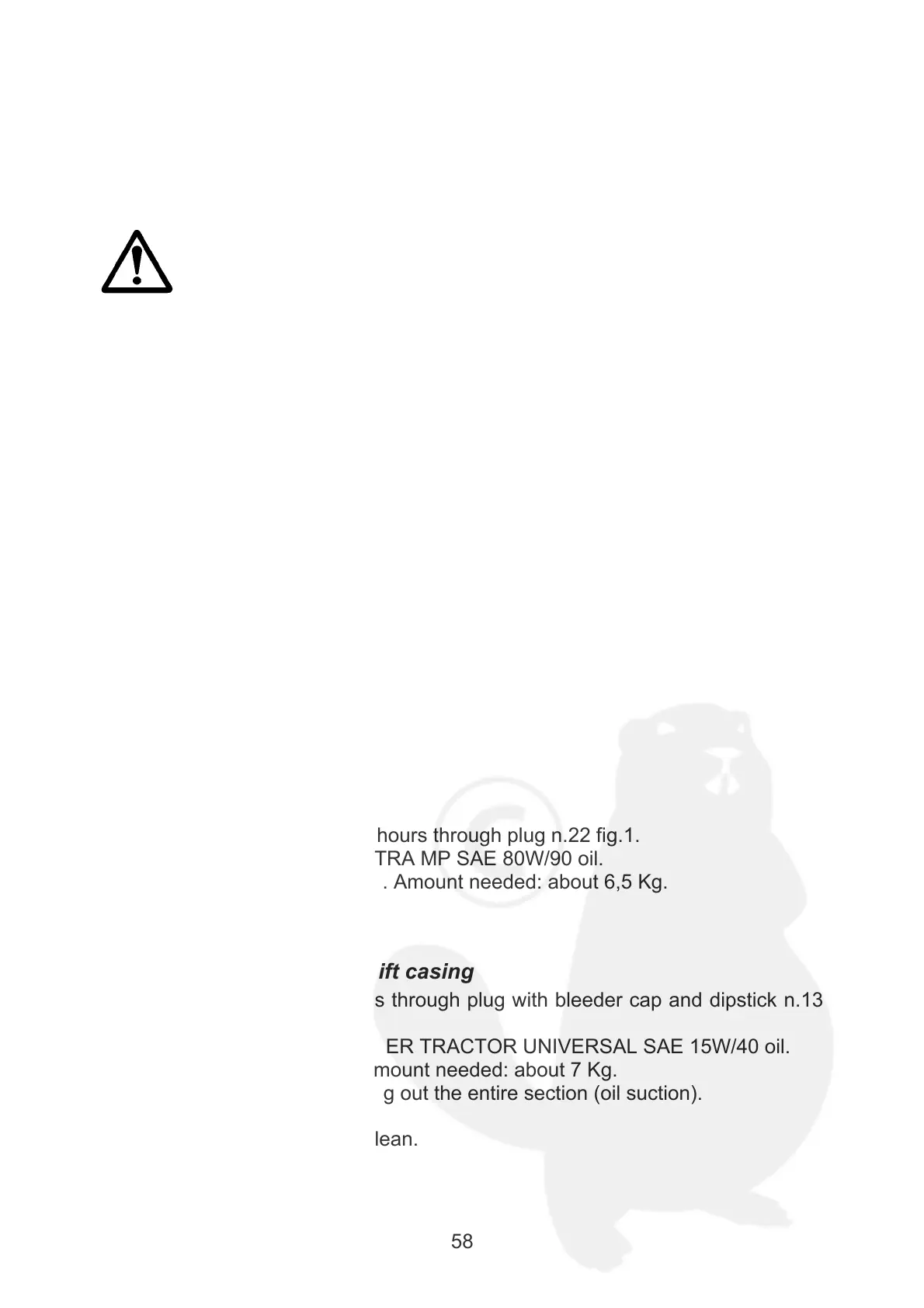 It is advisable to use AGIP SUPER TRACTOR UNIVERSAL SAE 15W/40 oil.
