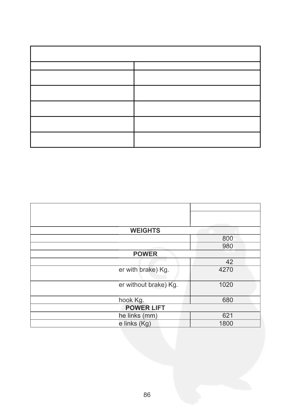 The values are approximate and refer to the tractor without ballast, with the