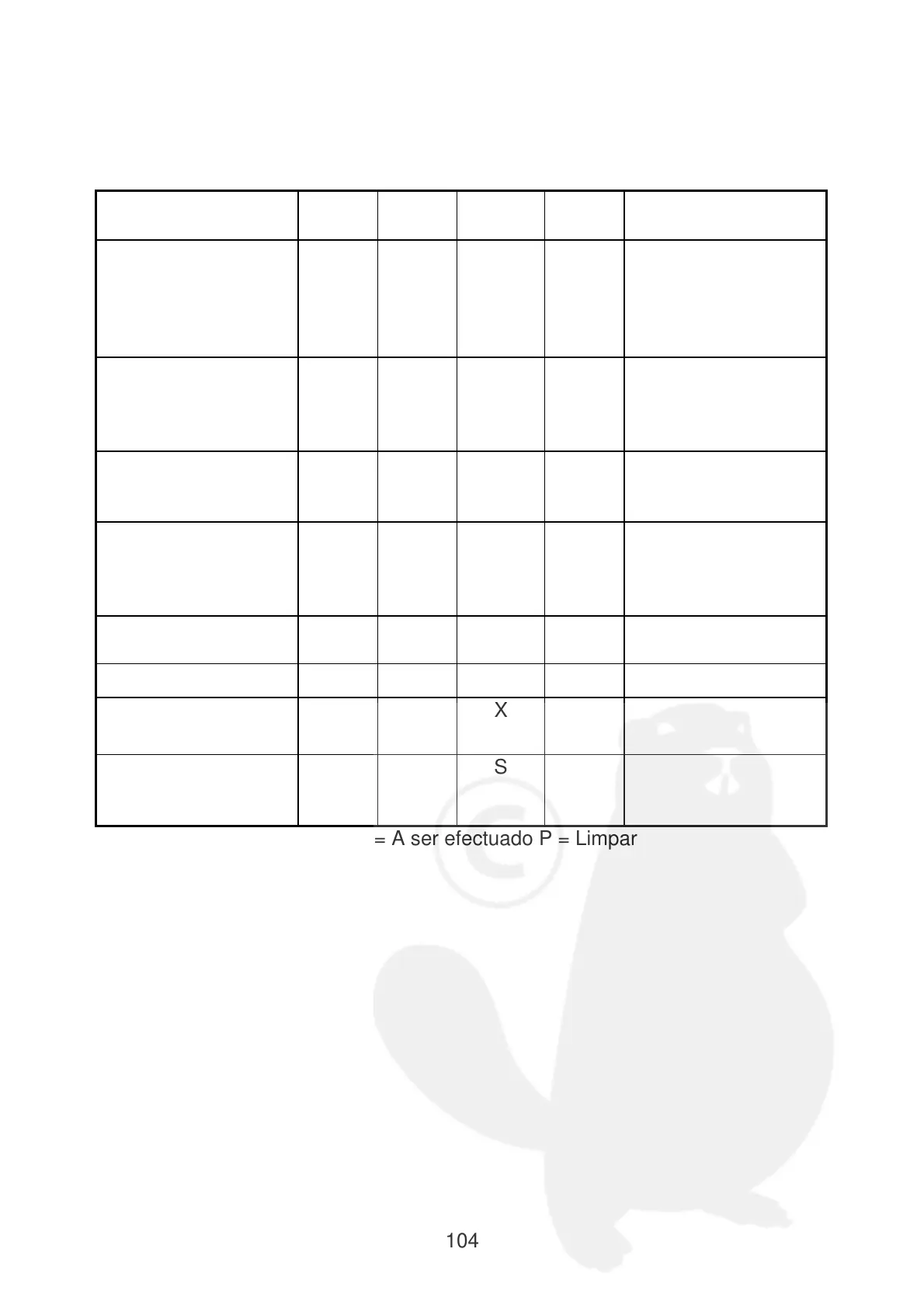V = Verificar, S = Substituir X = A ser efectuado P = Limpar