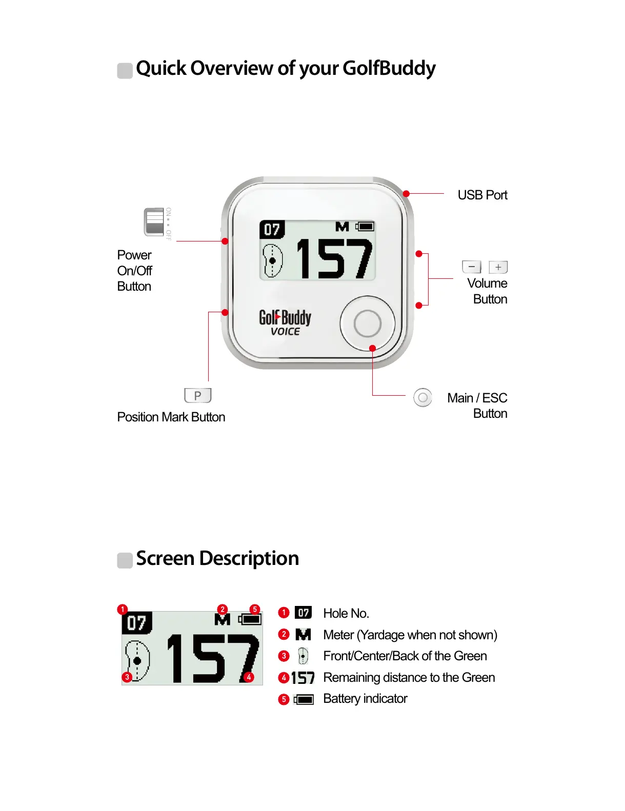 Golf Buddy Voice - Quick Overview of your GolfBuddy; Device Components Overview; Screen Display Explanation