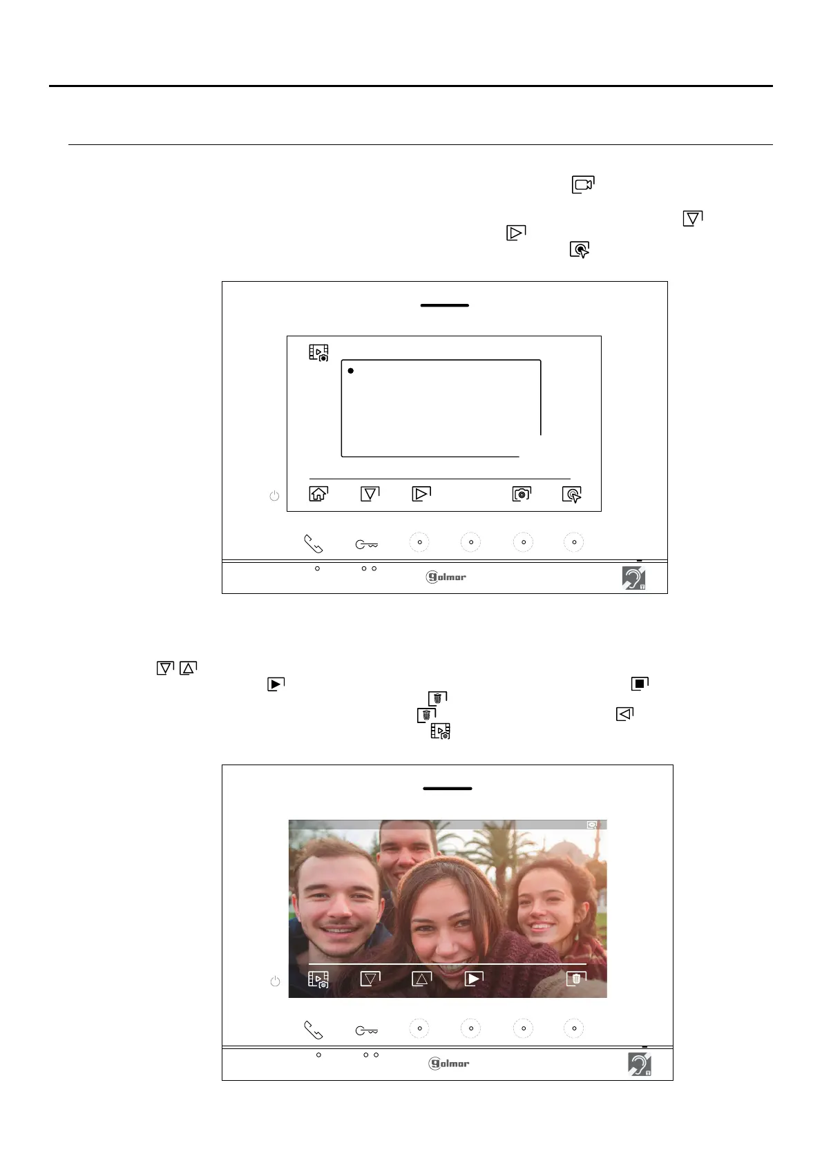 If a Micro SD card is inserted in the monitor, press the hidden button below icon to access the list of videos. In