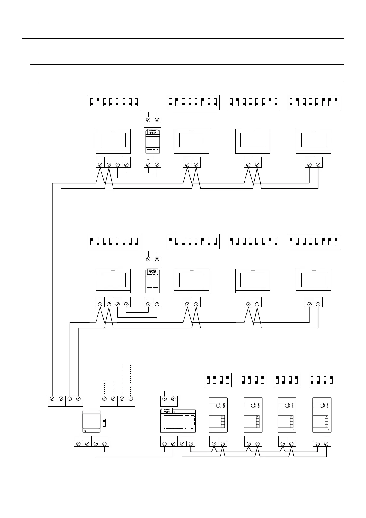 Four apartments with four access panels and up to four monitors in daisy chain connected