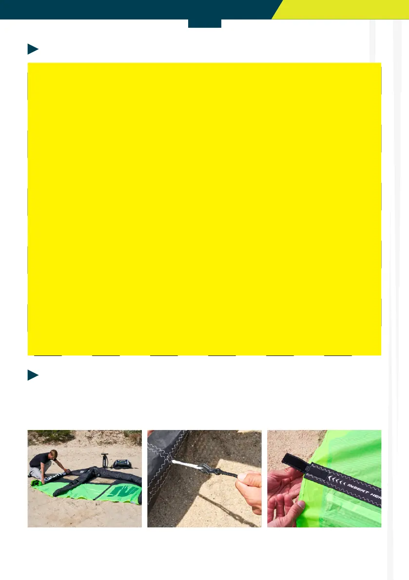 d’attaque proche de vous et perpendiculaire à l’axe du vent et sécurisez votre aile avec le leash de pompe.