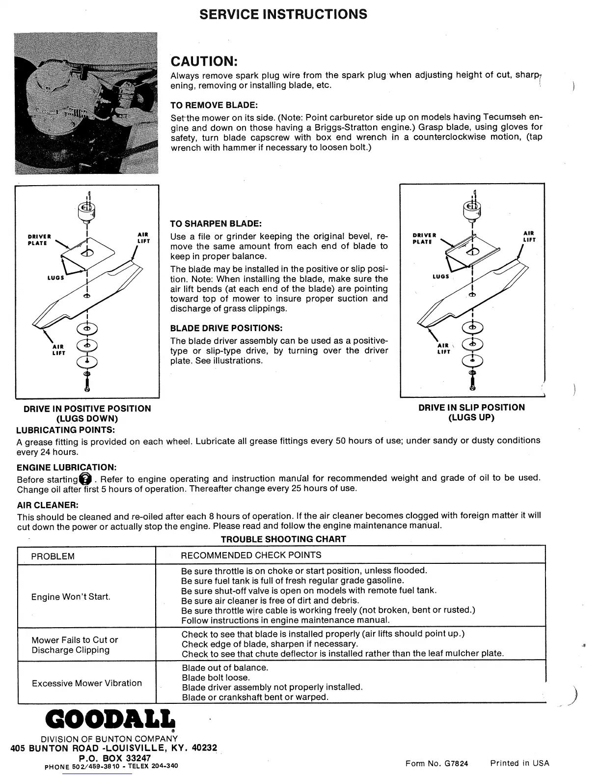 Goodall 18 - Service Instructions; Blade Removal and Sharpening; Blade Drive Positions; Lubrication Points