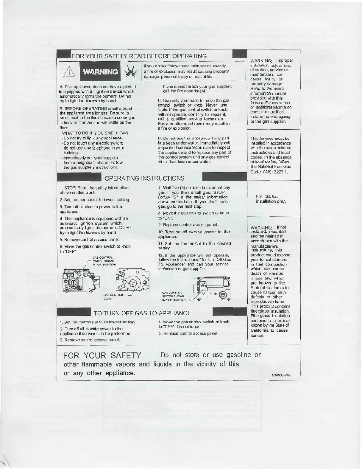Goodman GPG10360901A - Final Safety Checks and Operation; Pre-Operation Safety Checklist; Appliance Operation and Shut Down; Gas Supply Shut Off Procedure