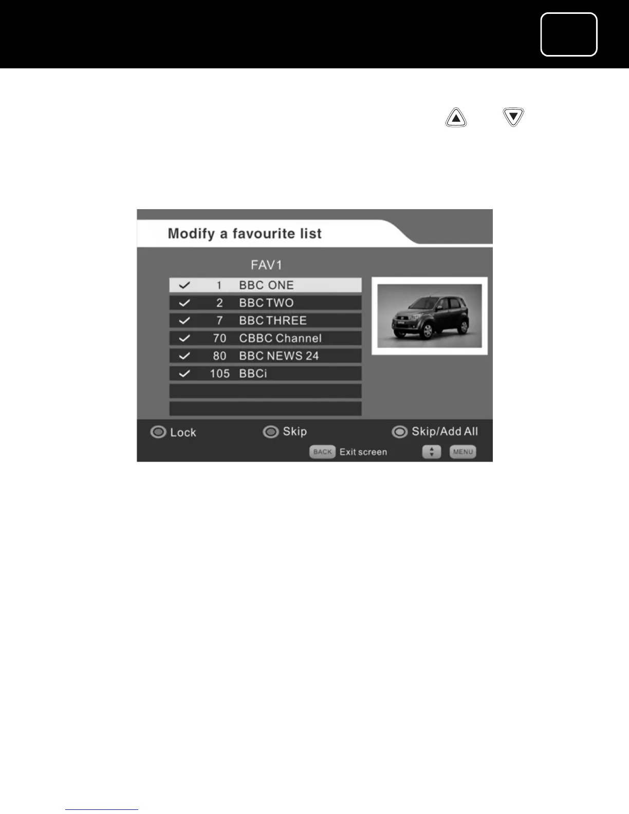 4 If you select the FAV1 or FAV2 channel list, you will see screen 2