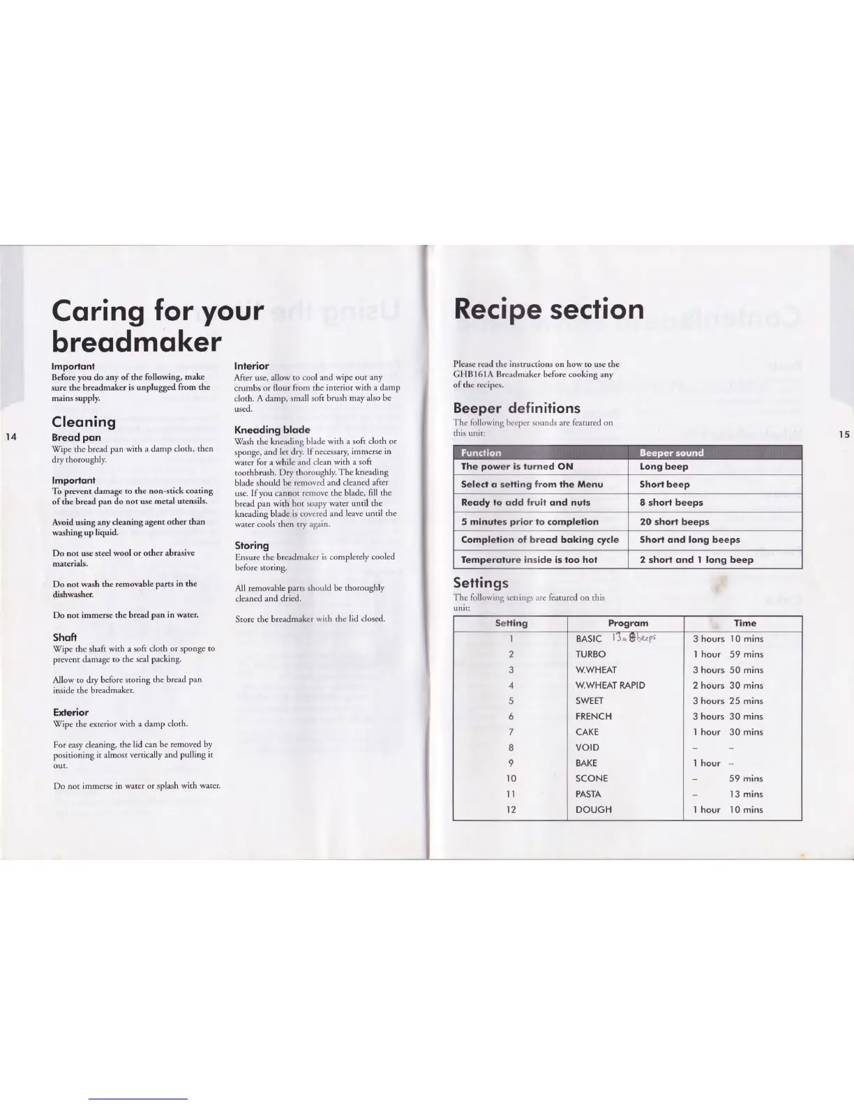 Goodmans GHB161A - Caring for Your Breadmaker; Recipe Section; Settings
