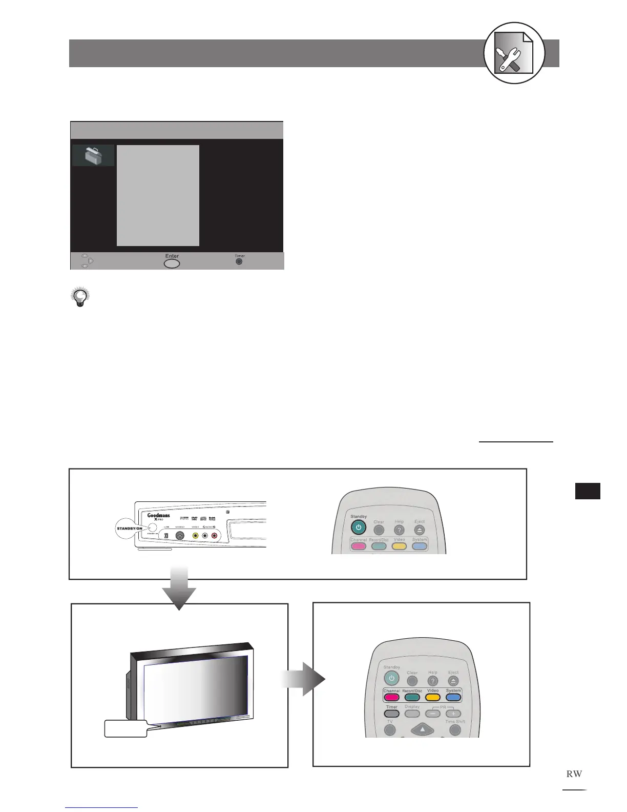 1. Press the STANDBY/ON button on the DVD Recorder or the Standby button on