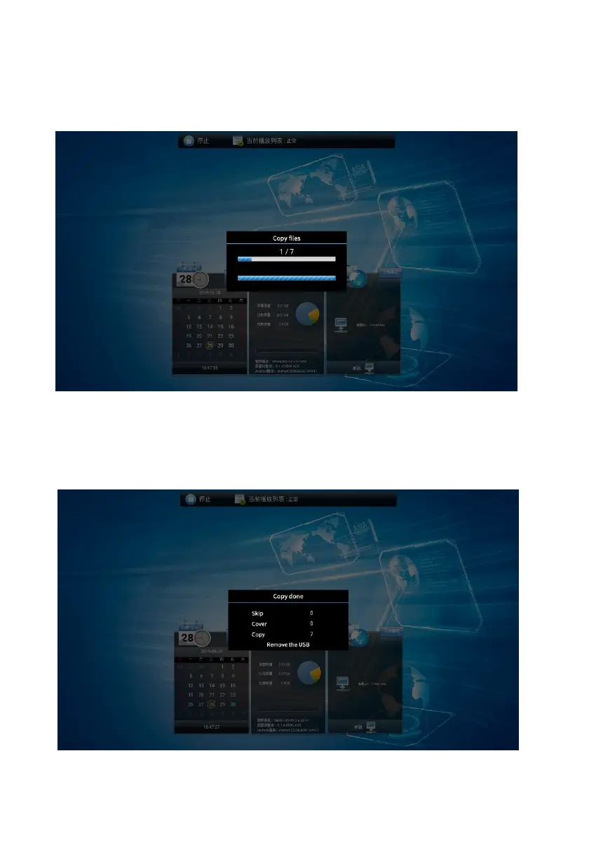 Copy video/picture to the root directory of the USB, insert the USB into the USB