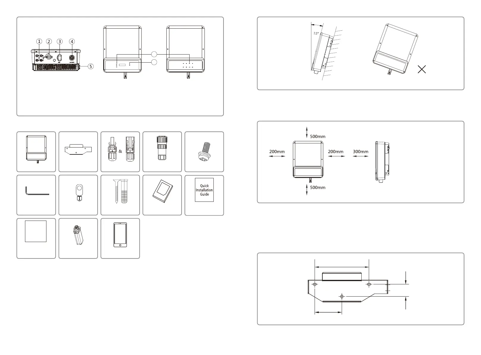 • The inverter must be installed vertical or with a backward tilt less than 15.No sideways tilt is