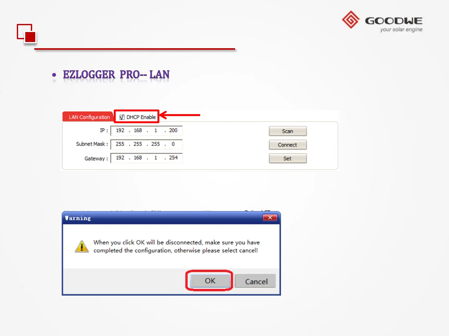 5 Click ‘DHCP Enable’, and there will be a warning displayed,