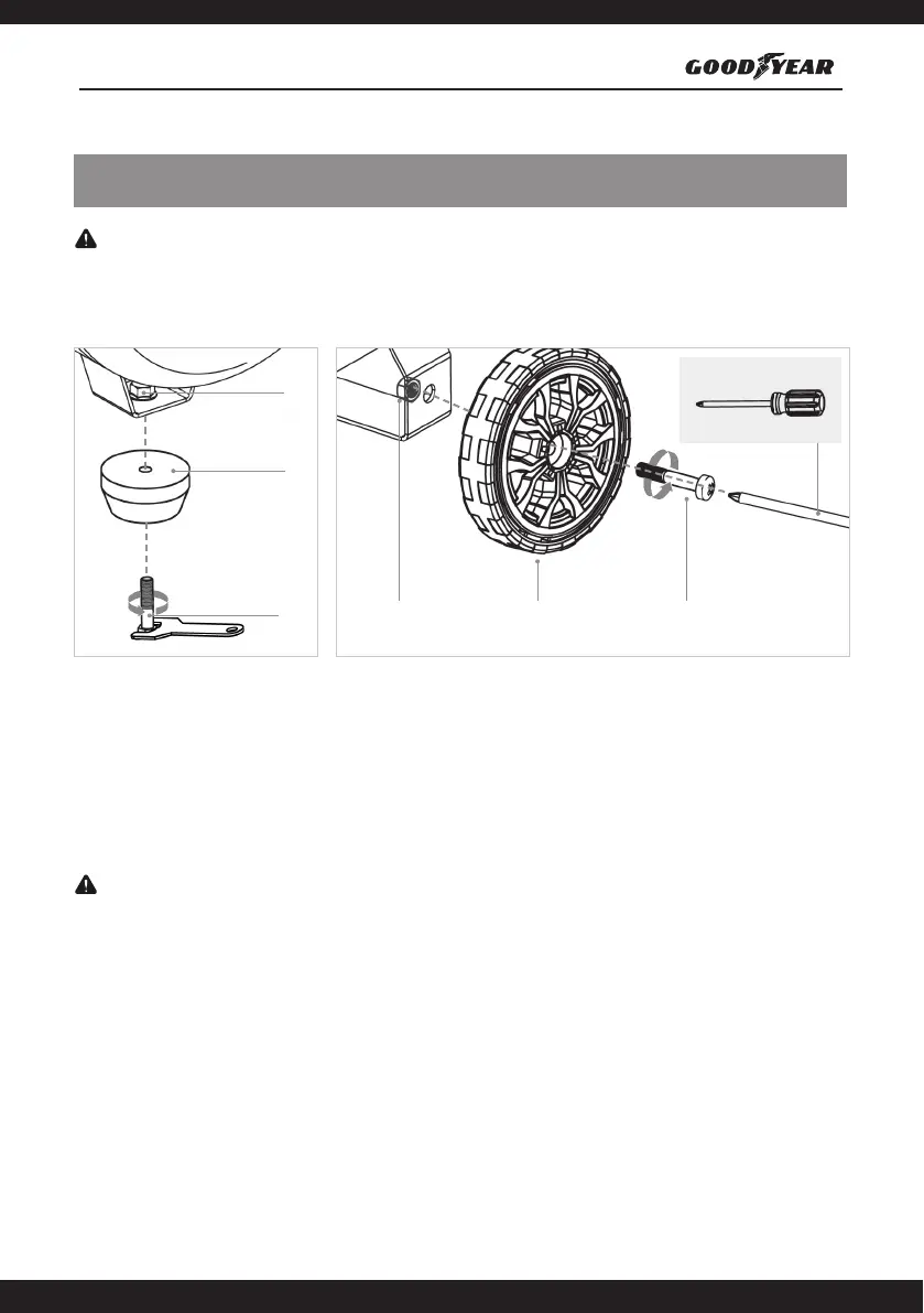 a través del oricio del enganche de la rueda. Asegure la rueda (E) con la tuerca (D). Repita estos pasos