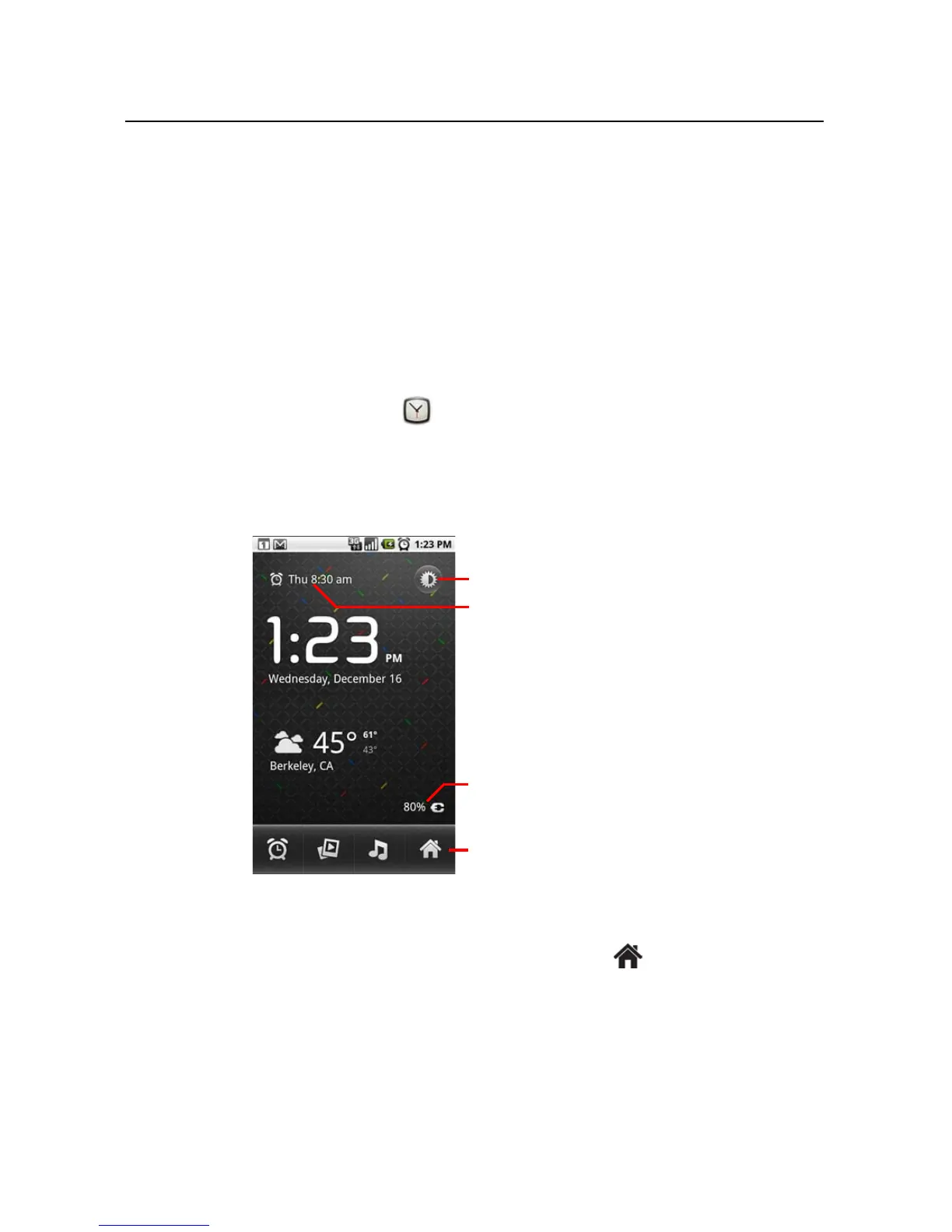 Clock opens with the date and time displayed on your Home screen wallpaper,