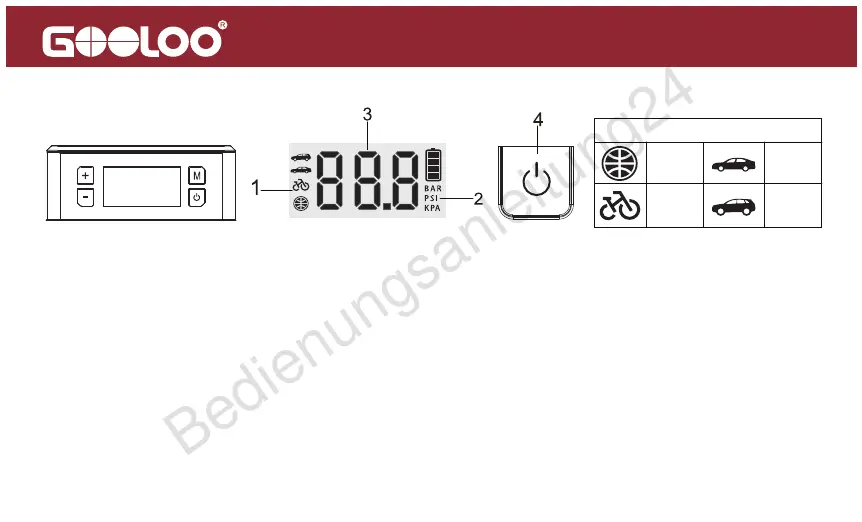 drücken Sie dann die Tasten „+“ oder „-“, um zwischen „BAR“, „PSI“ und „KPA“ zu wechseln.