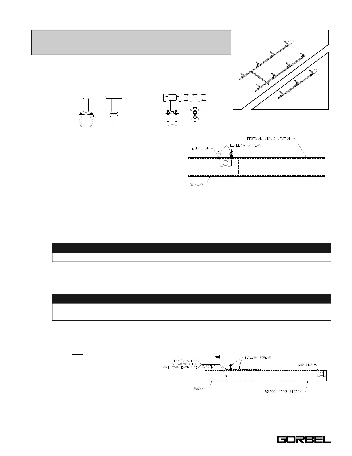 Use leveling screws located at top of festoon stack section to align it with runway/monorail.