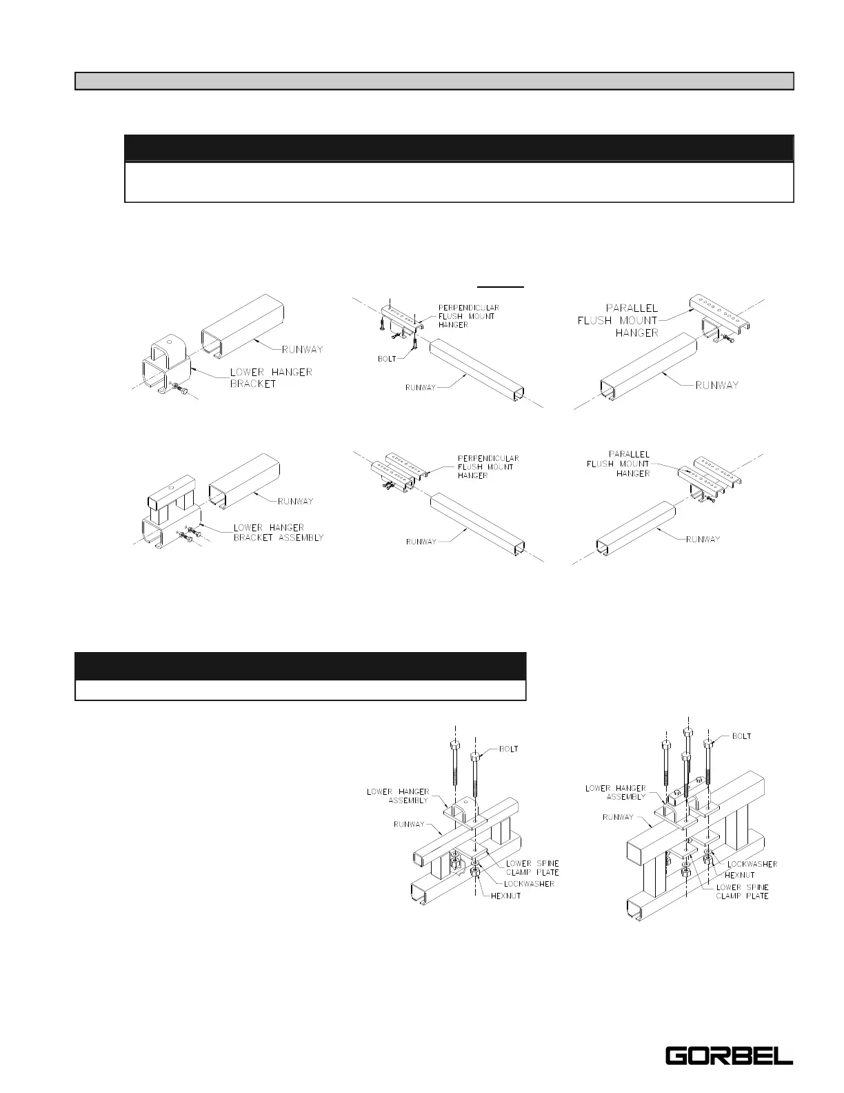 Slide lower hanger assembly over the runway track and bolt into place with clamping bolts