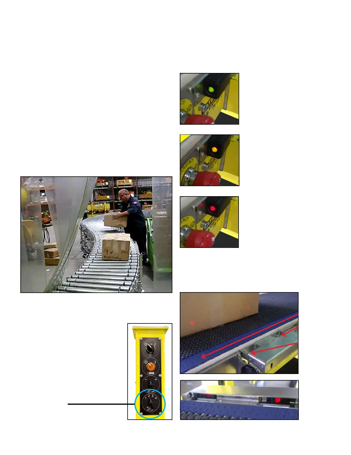 of front conveyor, facing operator. LED changes colour depend-