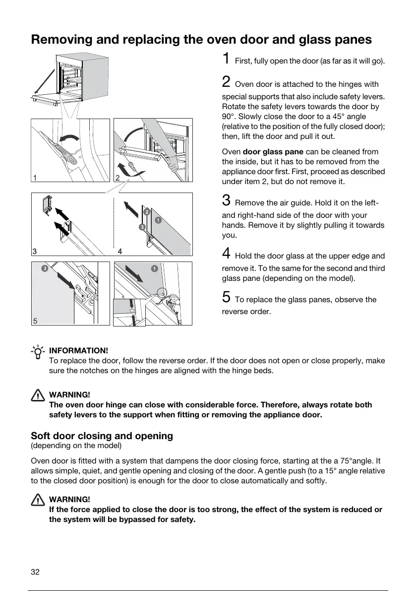 Oven door is fitted with a system that dampens the door closing force, starting at the a 75°angle. It