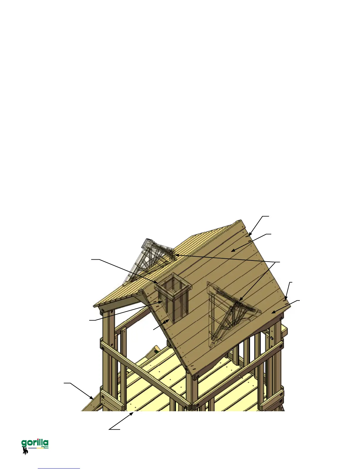 1: Place the 1 x 5 x 52” Roof Boards on top of the Roof Supports, tting the tongue into