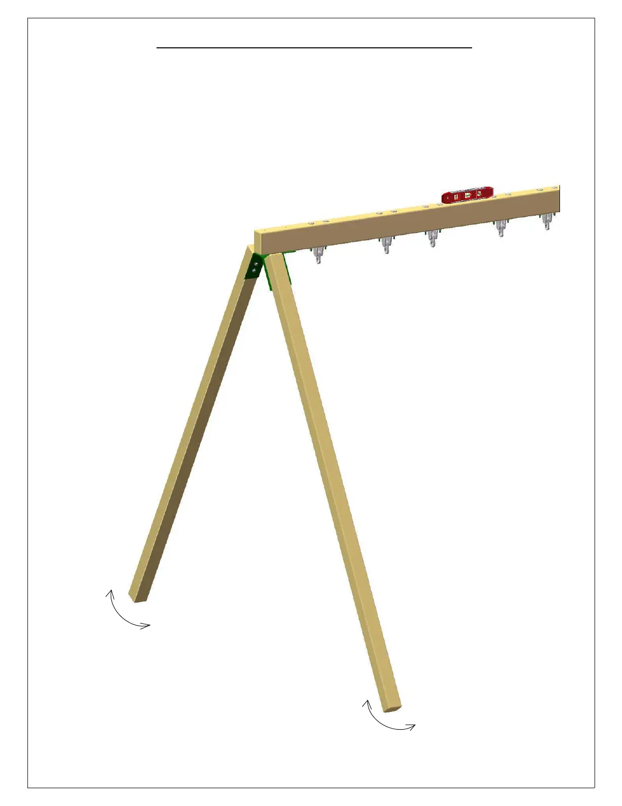 1: PLACE A LEVEL ON TOP OF THE SWING BEAM AND ADJUST THE LEGS IN OR OUT AS NEEDED TO MAKE THE