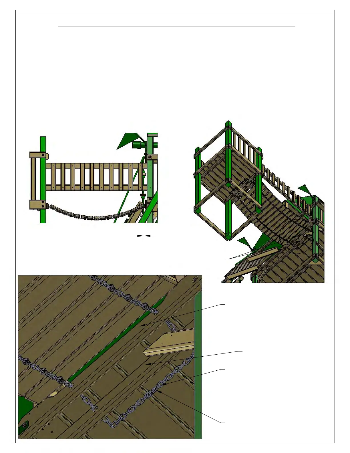 BOARD AT THE FRONT OF THE PLAY SET. THEN THREAD EACH CHAIN THROUGH THE HOLES IN THE DECK