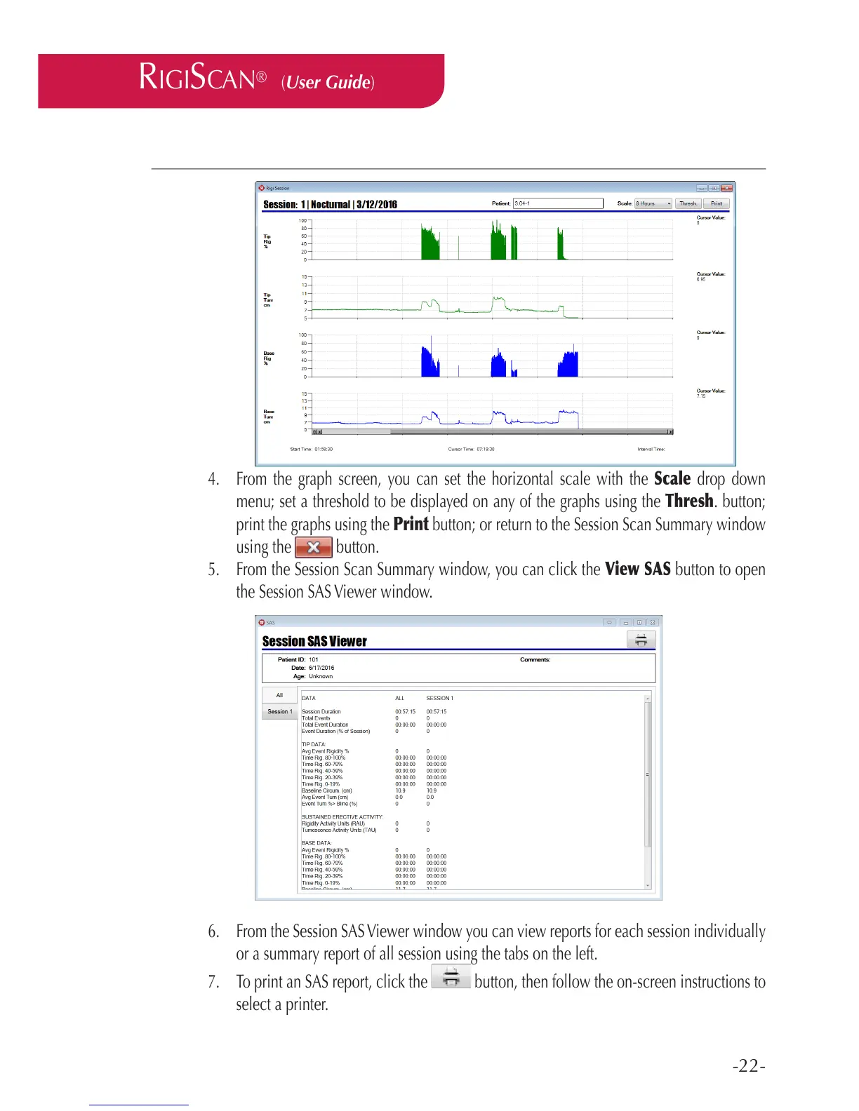 print the graphs using the Print button; or return to the Session Scan Summary window