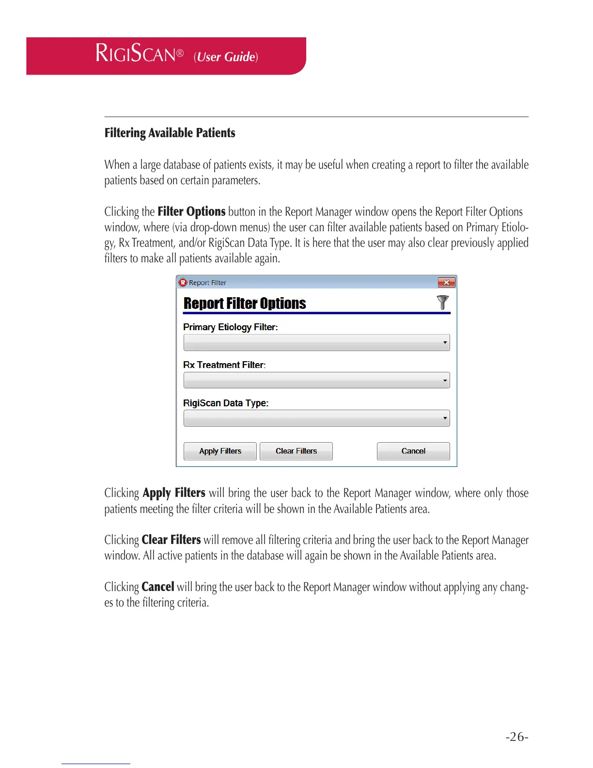 gy, Rx Treatment, and/or RigiScan Data Type. It is here that the user may also clear previously applied