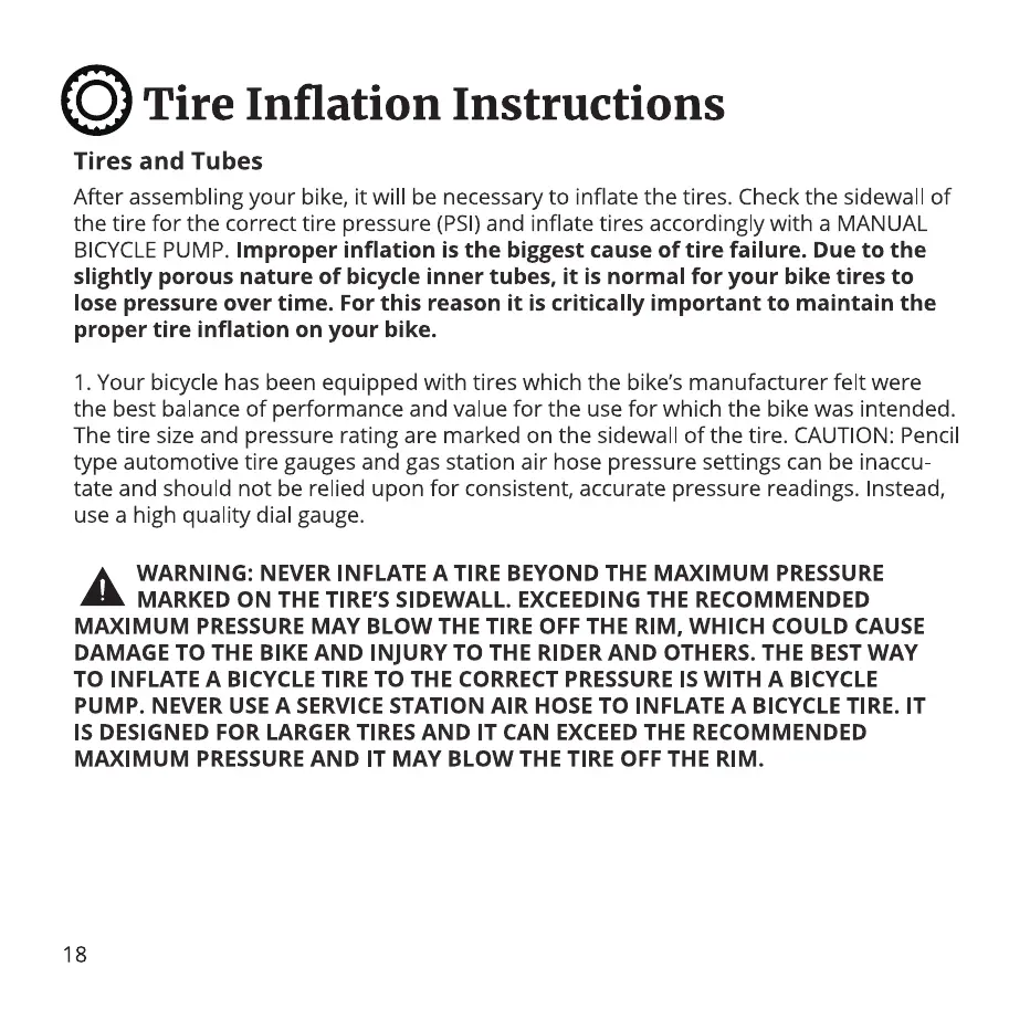 PUMP. NEVER USE A SERVICE STATION AIR HOSE TO INFLATE A BICYCLE TIRE. IT