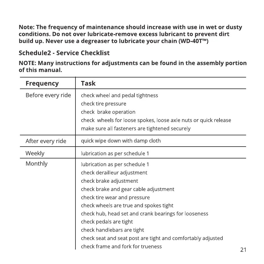 Note: The frequency of maintenance should increase with use in wet or dusty