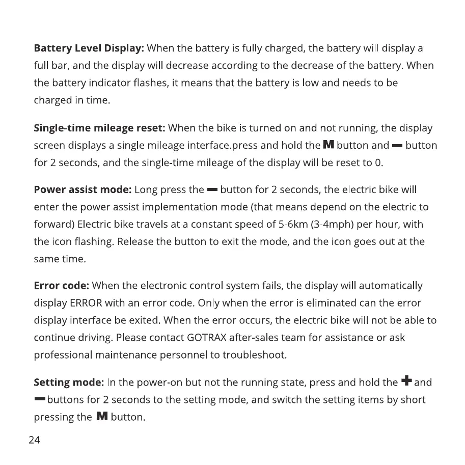 Power assist mode: Long press the — button for 2 seconds, the electric bike will
