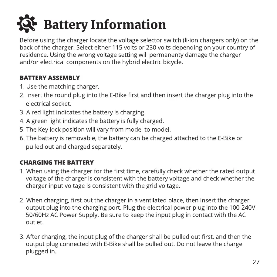 output plug connected with E-Bike shall be pulled out. Do not leave the charge