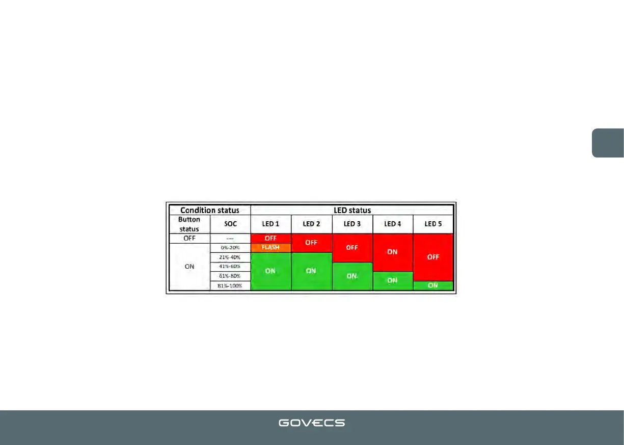 The battery displays the capacity information when pressing down the button or during charging. The LED pattern information is
