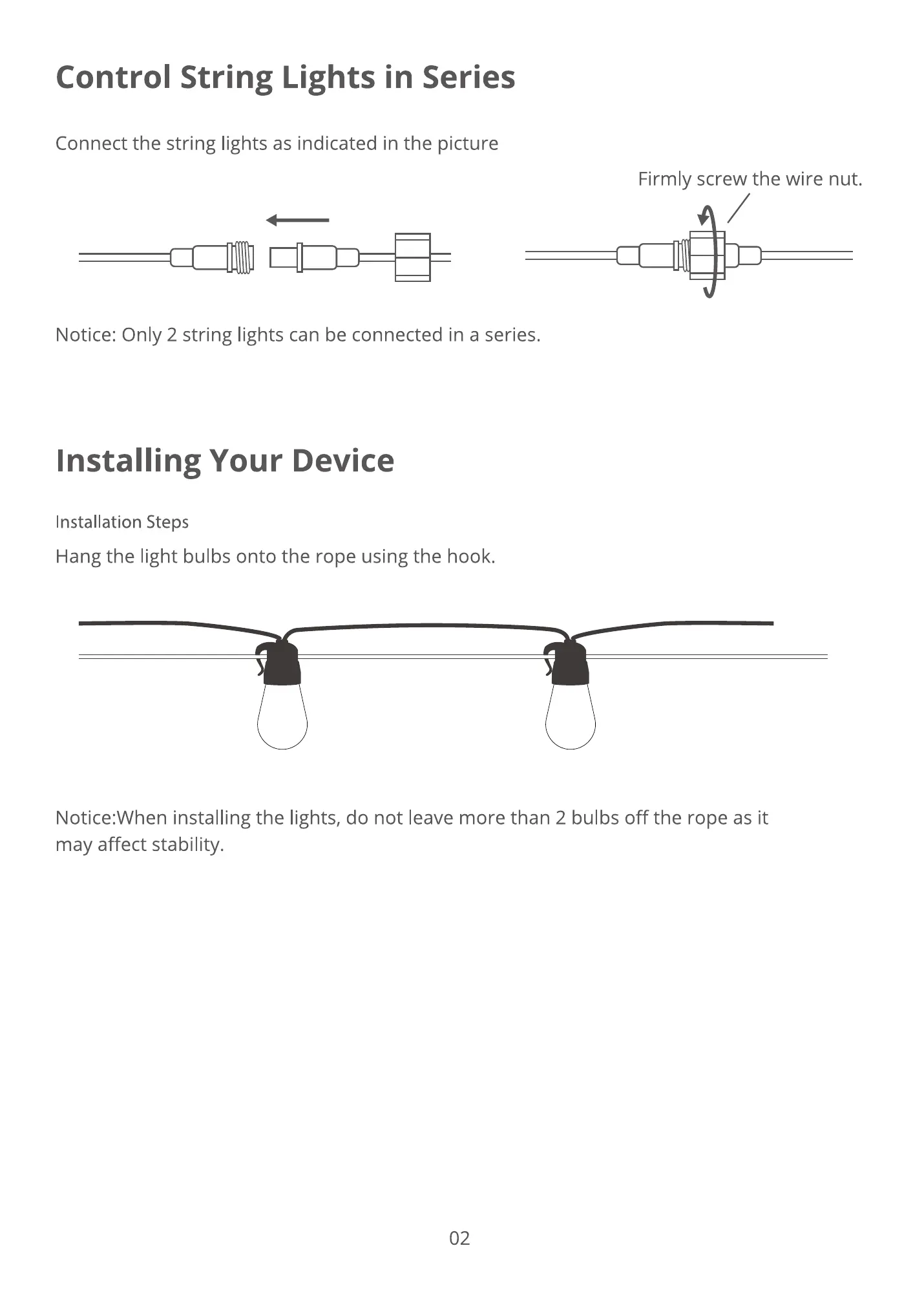 Notice:When installing the lights, do not leave more than 2 bulbs off the rope as it