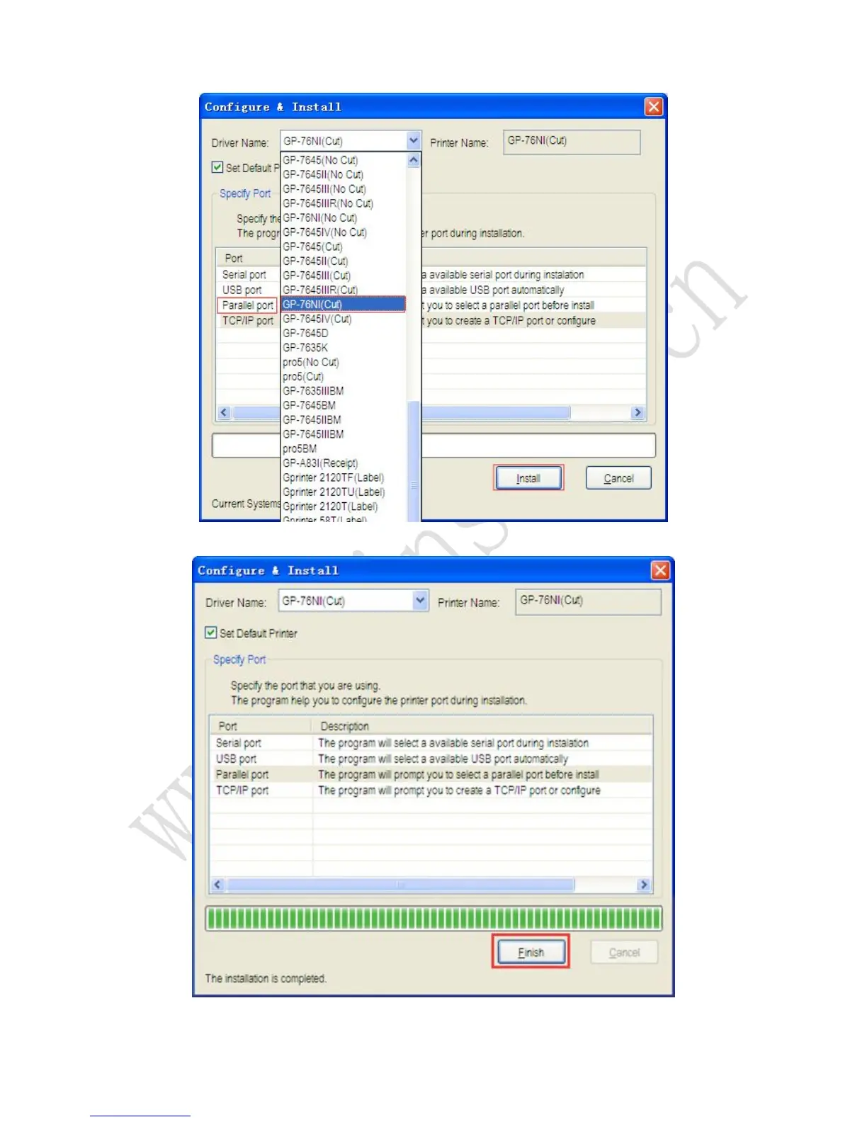 1.1 Select the 76NI(cut) and Parallel port to be used and click the “Install” button.