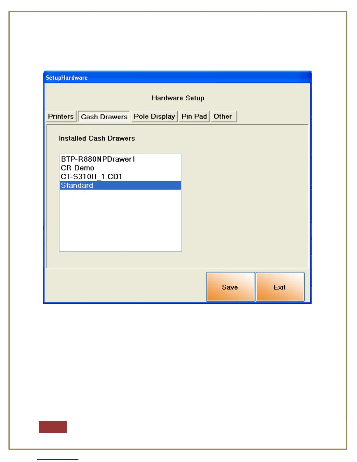 Select the cash drawers tab, and select the Standard cash drawer, Click Save then