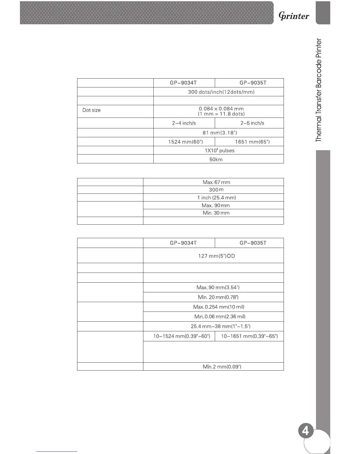 GPRINTER GP-9035T - 2.3 Printing Specifications; Model Comparison: Printing Specs; 2.5 Paper Specifications; Model Comparison: Paper Specs