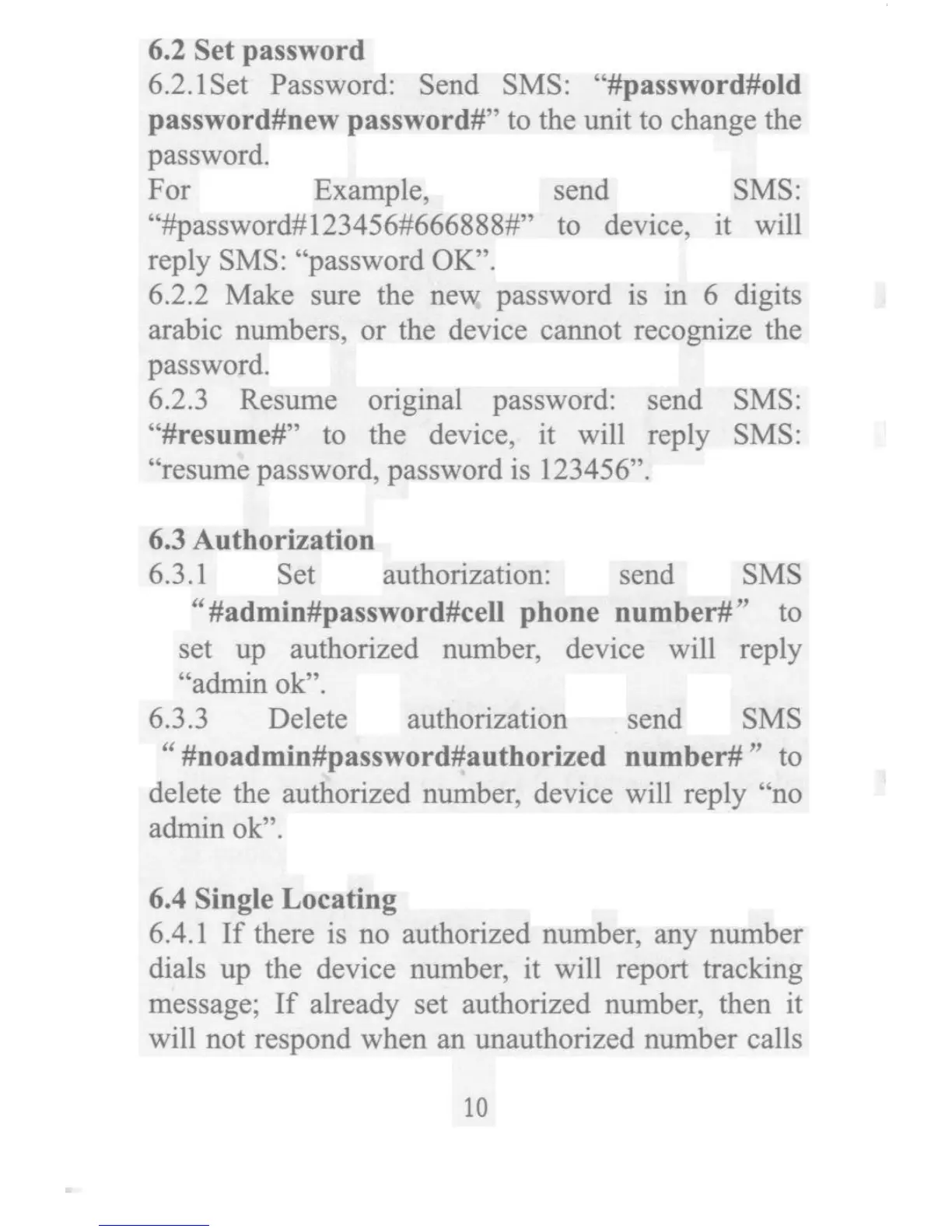 __ __ 6.2Setpas_word 6.2.ISet Password: Send SMS: ''#pas_word#old pas_word#new pa__word#'' to the 4nit to change the password. For Example, send SMS: ''#password#l23456#666888#'' to device, it will reply SMS: ''password OK''. 6.2.2 Make sure the new password is in 6 digits arabic numbers, or the device cannot recognize the password. 6.2.3 Resume original password: send SMS: ''#resume#'' ta the device, it will reply SMS: ''res4me password, password is l23456''. 6.3Authori2ation 6.3.1 Set authorization: send SMS #admin#password#cell phone number#'' to seE up autharized number, device will reply ''adminok''. 6.3.3 Delete authojzation send SMS #noadmin#passward#authari2ed number# '' to delete the authorized number, device will reply ''no adminok''. 6.4 Single Locating 6 .4. l If there is no authojzed n4mber, any n4mber dials up the device n4mber, it will report tracking message; If already set authorized number, then it wi1l nat respond when an unauthorized number calls 1O