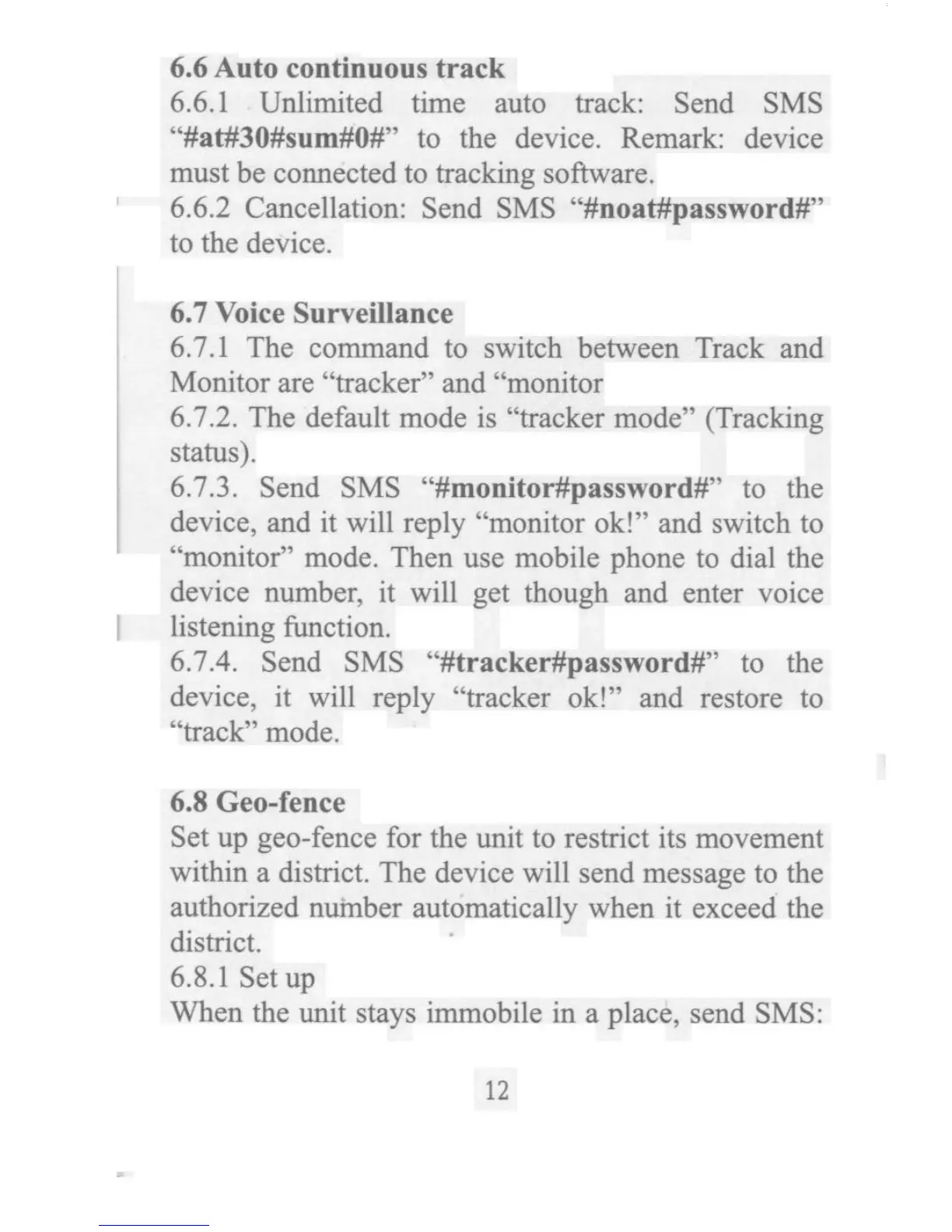 6.6 Auta con_nuous track 6.6.l Unlimited time auto track: Send SMS ''#at#30#sum#O#'' to the device. Remark: device must be connected to _acking sofhvare. 6.6.2 Cancel1ation: Send SMS ''#noa_pas_word#'' to thedevice. 6.7 Voice Surveillance 6.7.1 The command to switch behveen Track and Manitor are ''kacker'' and ''monitor 6.7.2. The defa4It mode is ''tracker mode'' (Tracking status). 6.7.3. Send SMS ''#monitor#password#'' ta the device, and it will reply ''monitor ok!'' and switch to ''monitor'' mode. Then 4se mobile phone to dial the device number, it will get though and enter voice IisteningnJnction. 6.7.4. Send SMS ''#tracker#password#'' to the device, it wiIl reply ''tracker ok!'' and restore to ''track''mode. 6.8Geo-rence Set up gea-fence for the unit to rest_ct its movement within a dist_ct. The device will send message to the authorized number automatically when it exceed the district. 6.8.l Setup When the unit stays immobile in a place, send SMS: 12