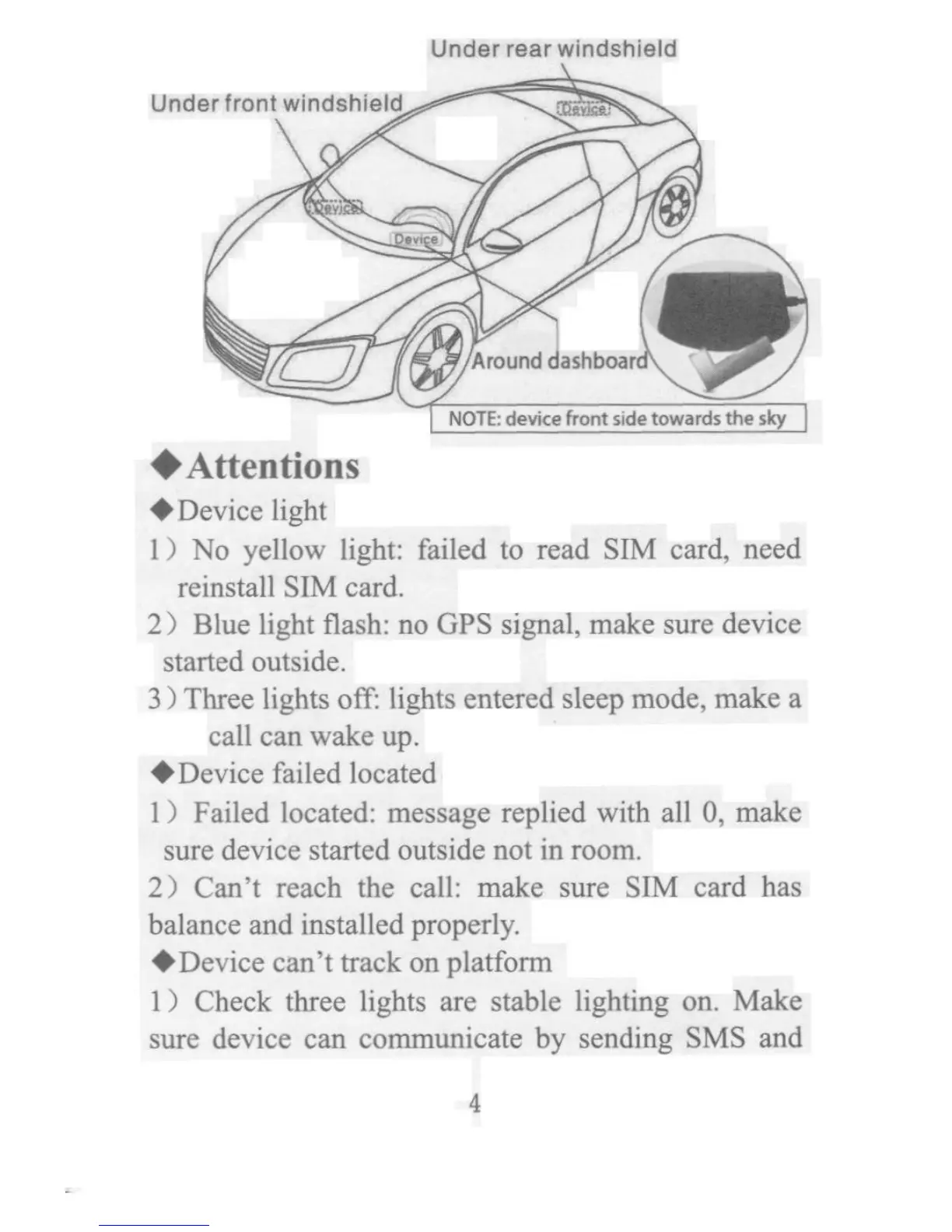 __r?_______________ __ Under rear windshield Under front windshie_d ___^^_^ _y_____ a_ m? 0_ .., 0a___ _ _ _ _ 0_ A,,u,d d, !,s,,_,, ,. _''U ' NOTE: device front side towards the _tcy tAttentions tDevice light l) No yellow light: failed to read SIM card, need reinstallSIM card. 2) Blue light nash: no GPS signal, make sure device stanedoutside. 3) Three lights ofT: lights entered sleep mode, make a call canwakeup. tDevice failed located l) Failed located: message replied with all O, make sure device sta_ed o4tside not in room. 2) Can't reach the call: make sure STM card has balance and installed properly. tDevice cani kack on platform l) Check three lights are stable lighting on. Make sure device can communicate by sending SMS and 4