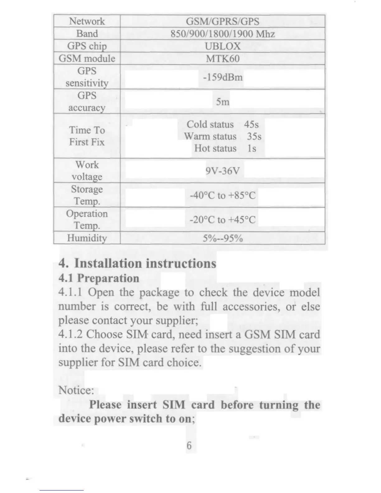 _TFTT F 2Hoo9cv_36v cc _Nemo_k Gsm/GPRs/GPs _B 8so/9oo/ 1 8oo/ 1 9oa Mhz _G_s chi0 uBLox _GsMmodule mTK6o GPS ... -5 Bm "n_!p'_' Sm "CCU'"C . Caldstatus 4Ss ImeTO . . W4_Stat4S 35S IrSt IX OtStatuS lS Work volta0oe Storage +gso -400C tO em0.O perat ion +4so - tO em 0. _Humid it so/o--9so/o 4. In_talla_on in_tructions 4.IPreparatio_ 4. 1. l Open the package to check the device model n4mber is co_ect, be with _ll accessories, or else please contact yo4r supplier; 4. I .2 Choose SIM_ card, need inse_ a GSM SIM card into the device, please refer to the suggestion of yo4r s4pplier for SIM card choice. Notice: Plea_e in_ert SIM card be Fore turning the device power smtch to on; 6