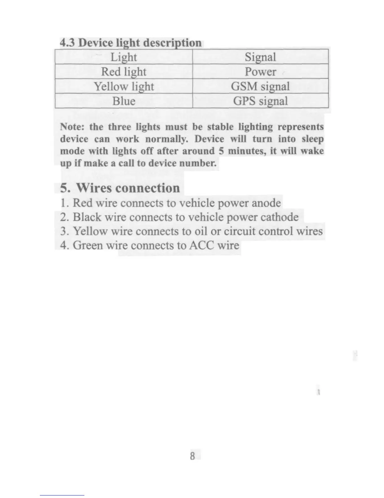 _ q.3 Device li 0_ ht descri 0 tjon __s_0_nal _Red li0_ht __ower _yellow __00ht _GsM si00nal _B _Gis si00nal Note: the three lights must be stable ligh_ng repre_ents device can work norm8lly. De_ce will turn into sleep mode with lights a_ 8Fter araund S minutes, it _l w8ke up iF m8ke 8 call to device number. 5. Wires connection l. Red wire connects to vehicle power anode 2. BIack wire connects to vehicle power cathode 3. Yellow wire connects to oil or circuit con_oI wires 4. Green wire connects To ACC wire 8