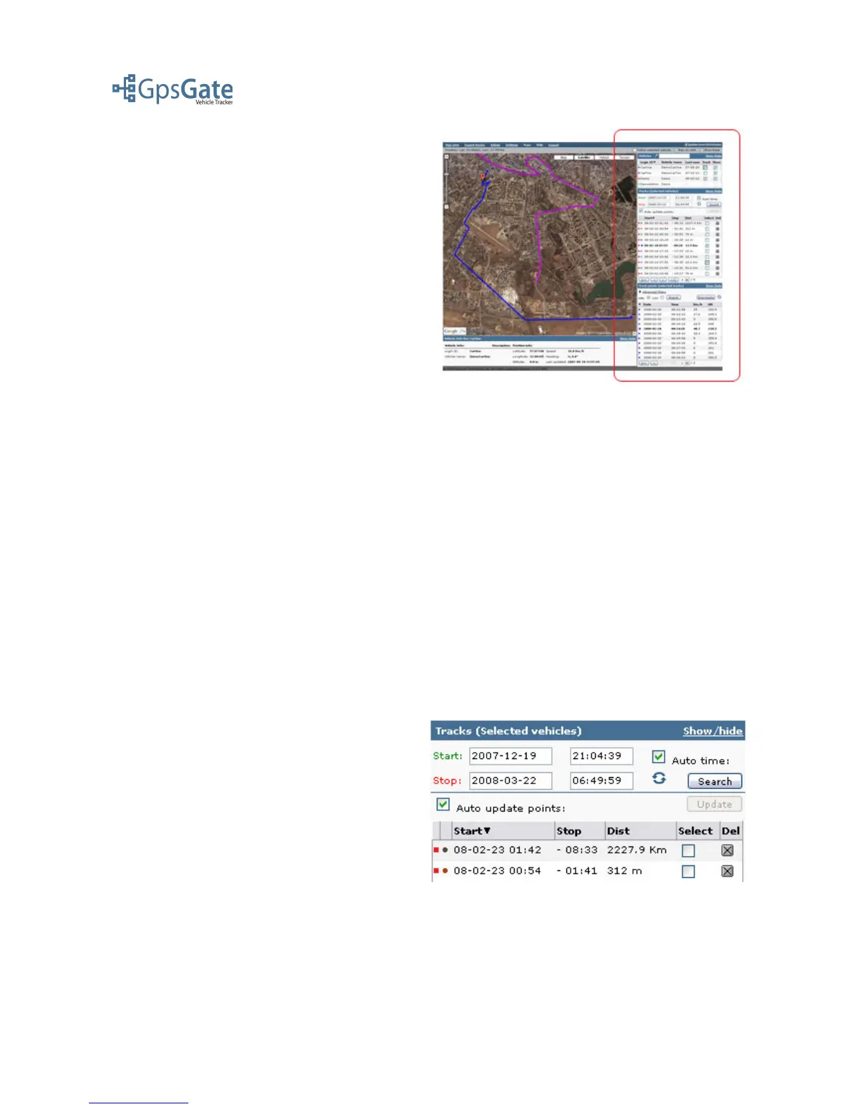 displays the selected Users/Vehicles different tracks, sorted with the newest track first in the list.