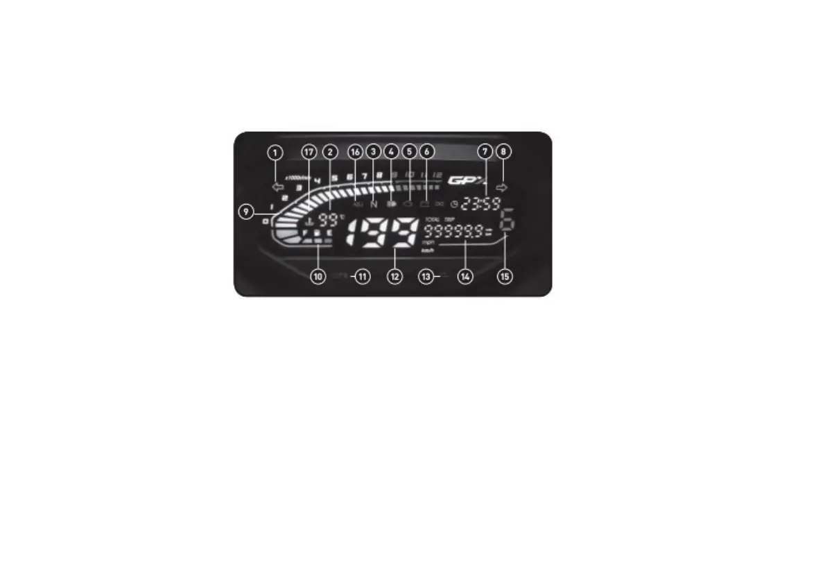 3.) Neutral gear light (N) 8.) Right turning light 13.) ADJ light