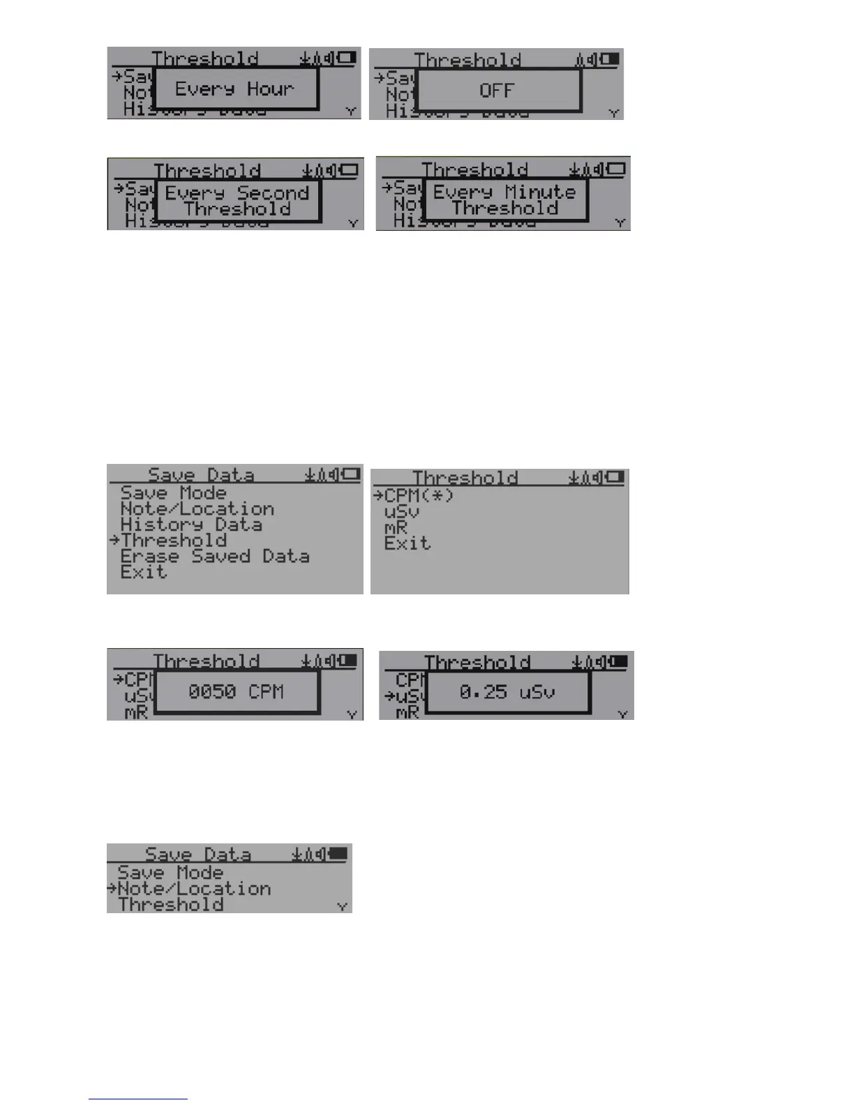 OFF -> Every Second ->Every Minute -> Every Hour->Every Second Threshold->Every Minute