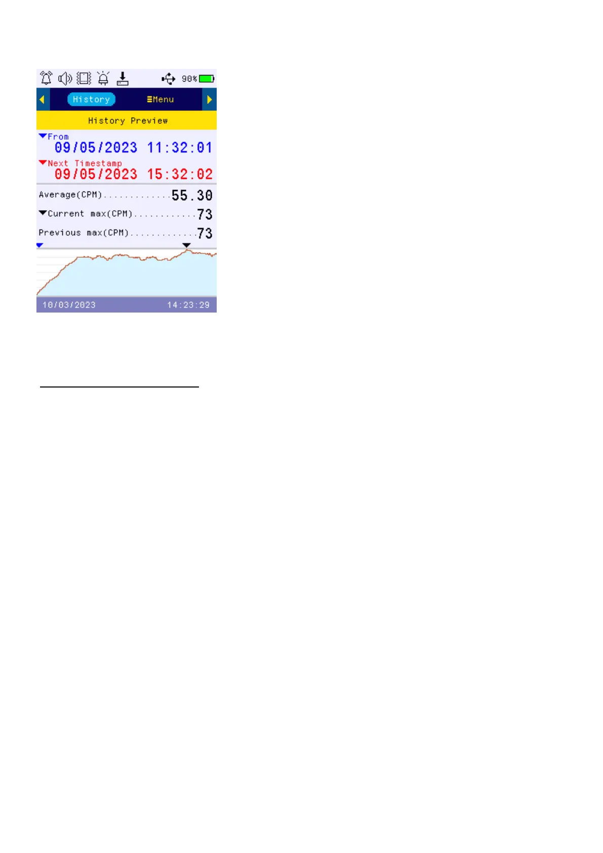 In History mode, the device displays historical data stored in internal flash memory.